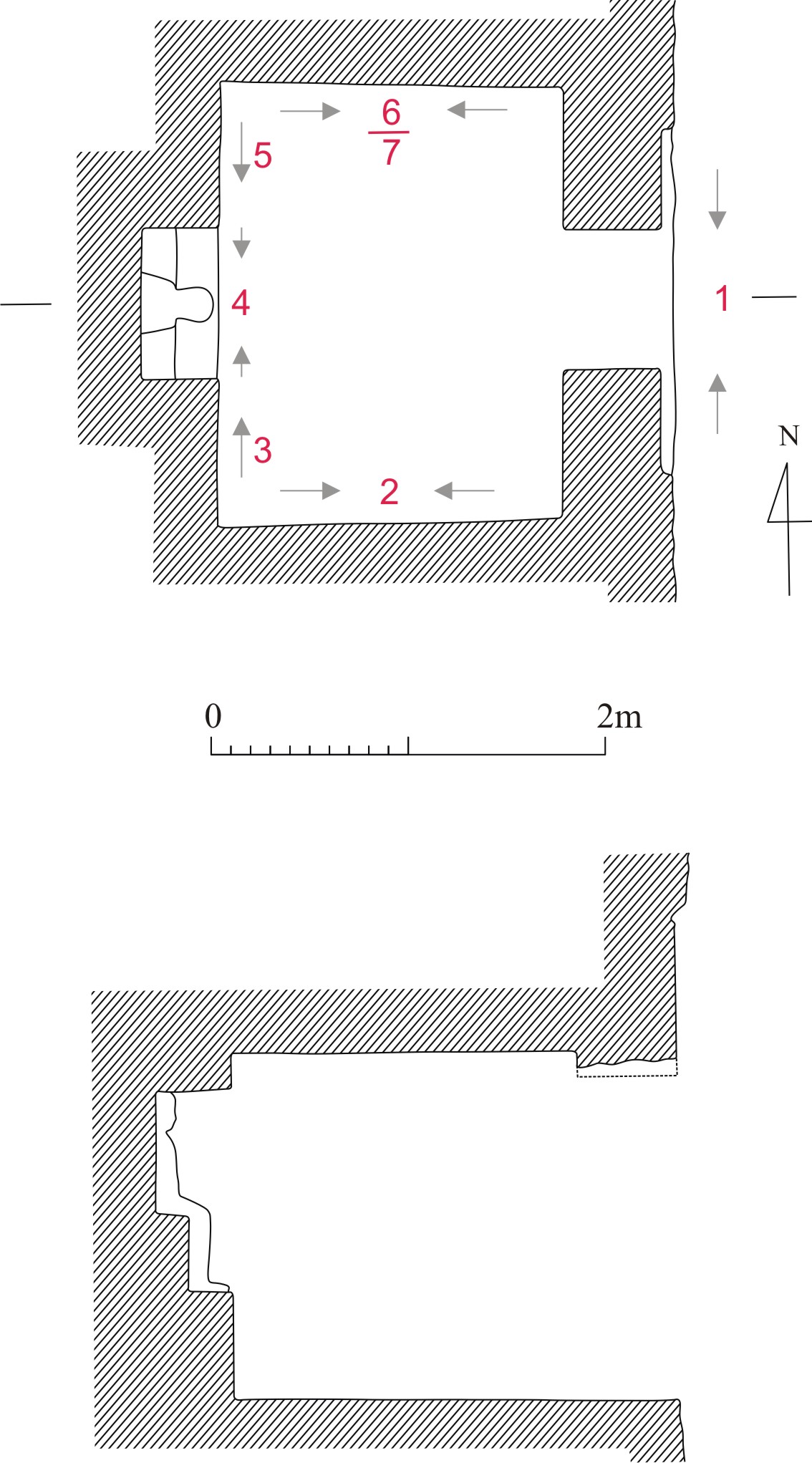 Shrine 6 was entirely cut in the rock and has a typical plan: it consists of a single room with a flat ceiling and a niche for a statue in the rear wall. The door is damaged in the lower part. The decoration of the shrine was almost finished, only north part of the ceiling remained prepared for decoration which had never been made. The main room is 2.2m wide and 1.75m deep, the height of the room is 1.75m. It has a partially decorated ceiling, the decoration, although seriously damaged in lower parts, is preserved on the walls. The scenes of the main room were prepared with the whitewash and painted, the background of scenes was yellow and surrounded by a block border painted yellow, green, black and blue. Only the text of the door frame of the niche was carved. The owner of the shrine, Ah-mes, was identified with Ah-mes Pen-iaty,[1] but R.A. Caminos and T.H.G. James were opposed to it, arguing that the owner of shrine 6 bore high titles (jrj-pʿt, ḥȝtj-ʿ and high priestly titles) that were never attested for Pen-iaty.[2]